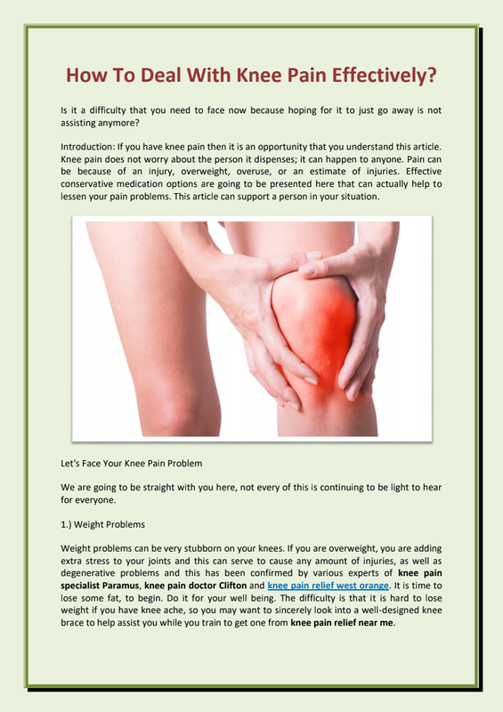 If you have been experiencing knee pain for rather some time you have probably gone to the knee specialist NJ to figure out what is creating it and exactly how to obtain knee pain relief. In many cases the knee problem may be the outcome of an injury and need to be fixed by surgical treatment. Often times, nevertheless, the knee may still be bothersome after the procedure and you may have to take medicines once in a while to numb it.