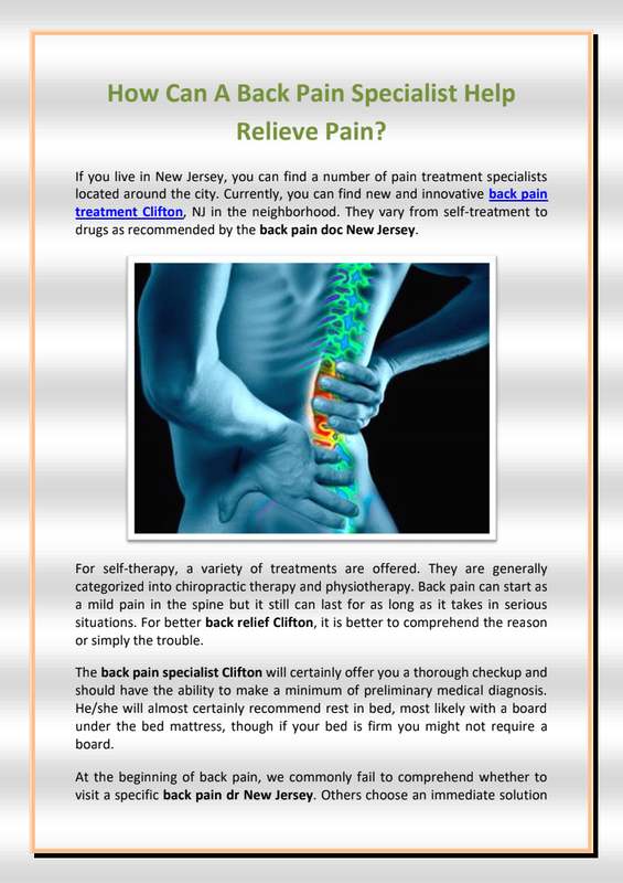 Back pain is one of the most excruciating pain that can upheaval your life and daily work. There are many New Jersey back pain centers around. There is for that reason no need to fret if you need to find treatment for back pain that is threatening to wreck your life. The actual issue is just how to locate a back center that will provide you the type of treatment you like. Right here's how to find out where to go when you are in New Jersey: