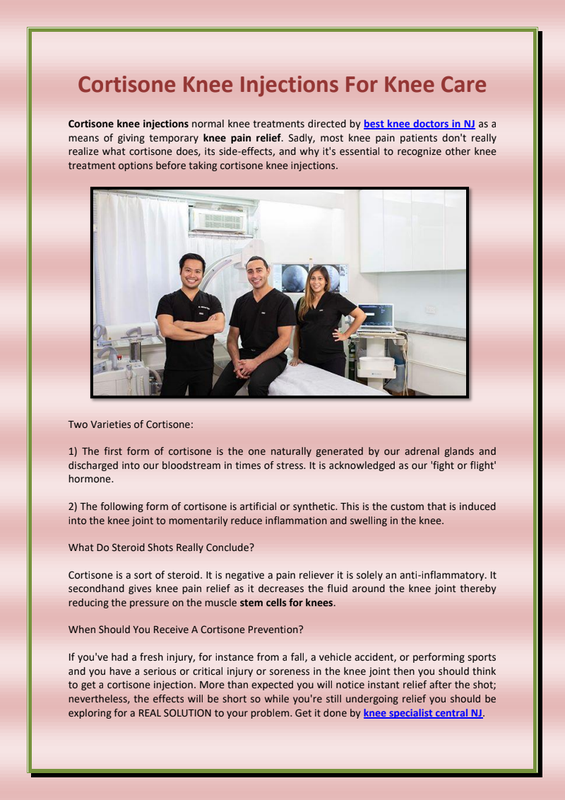 Cortisone knee injections or steroid injections are common knee pain treatment recommended by the best knee doctors in NJ as a way of supplying momentary knee pain alleviation. Regrettably, many knee pain patients don't really understand what cortisone does, its side-effects, as well as why it is very important to think about various other knee pain treatment options before getting cortisone knee injections. Continue reading to get an overview of these cortisone knee injections.