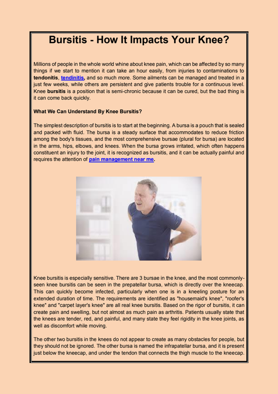 When getting equipped for the operation & knee pain relief let the doctor identifies weeks forward of time what prescriptions and medicine you are having. Then follow his view on whether or not to discontinue practice leading up to the operation. For more information visit paintreatmentspecialists.com now!