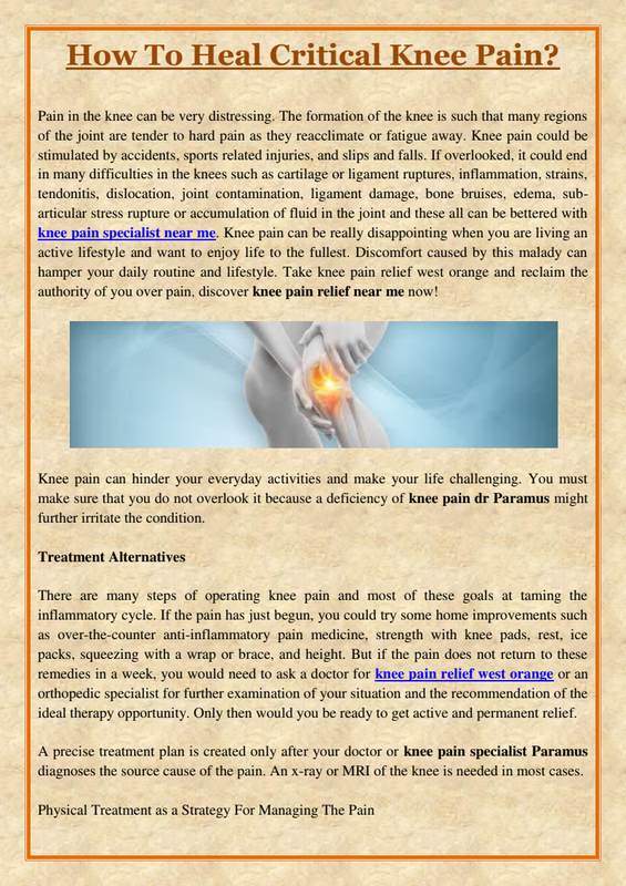 You're likely to start by seeing knee pain relief near me doctor. Depending upon the cause of your knee pain, he or she may refer you to a doctor specializing in joint diseases (rheumatologist), joint surgery (orthopaedic surgeon) or sports medicine. Best knee doctors in NJ have specialists in the treatment of knee pain and also make records to prevent ageing knee pain, joint pain.
